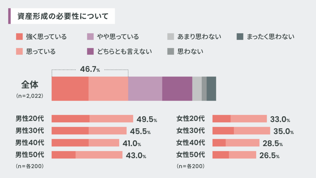 資産形成に対する意識を見ると、全体(n=2,022)の46.5%が「資産形成の必要性がある」と回答しました(「強く思っている」と「思っている」の合計)。性・年代別に見ていくと、男性では20代(49.5%:n=200)が、女性では30代(35.0%:n=200)が最も高くなっています。徐々にではありますが中高教育における投資リテラシー向上への取り組みも広がり、この数年で投資に関する情報へのアクセスも飛躍的に容易になったことで、20代・30代の間で投資に対する関心が高まっていることが読み取れるでしょう。