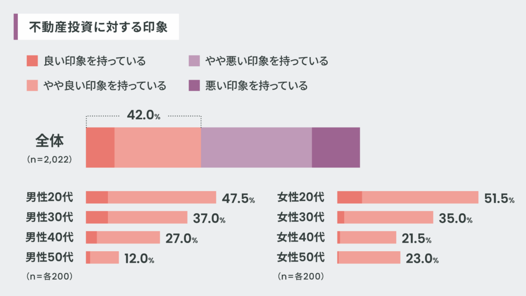資産形成の代表的な手段のひとつである「不動産投資」。不動産投資に対する印象については、全体(n=2,022)の42.0%が「良い印象を持っている」と回答しました(「良い印象を持っている」と「やや良い印象を持っている」の合計)。性・年代別では、男性(47.5%:n=200)・女性(51.5%:n=200)ともに20代が最も高くなっており、全体的には「年齢とともに不動産投資に対して好印象を抱く割合が低下する」という結果が明らかに。若い世代が投資全般や現物資産保有の価値に対する知識を高め、その魅力に気づき始めている一方で、40代・50代は1990年代の不動産バブルの「負の記憶」も含めて、不動産投資のリスクに敏感になり過ぎ、やや懐疑的な傾向が見られるのかもしれません。