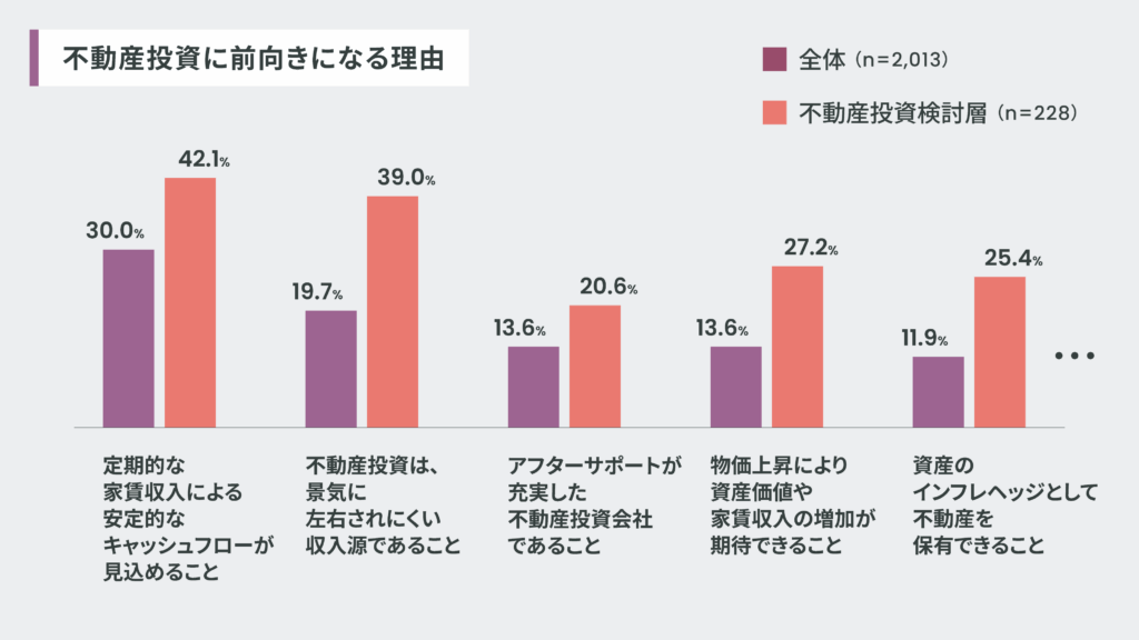 「不動産投資に前向きになる理由」について、全体(n=2,013)では「定期的な家賃収入による安定的なキャッシュフローが見込めること」が30.0%、「不動産投資は景気に左右されにくい収入源であること」が19.7%、「物価上昇により資産価値や家賃収入の増加が期待できること」が13.6%と上位を占めました。特に「不動産投資検討層(n=228)」においては、それぞれ42.1%、39.0%、27.2%と高い数値を示しており、不動産投資が持つ実利的なメリットを的確に理解していることがうかがる結果となりました。