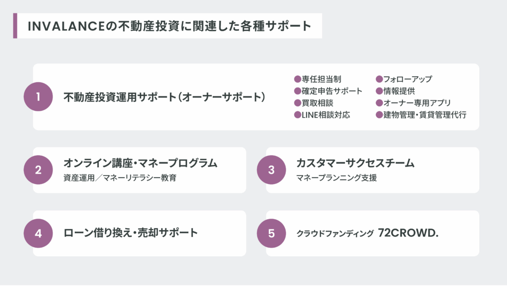 こうした新たな取り組みと並行して、INVALANCEでは不動産投資に関連した各種サポートを展開しています。すでに物件をご購入いただいたオーナー様向けのサポートはもちろんのこと、「これから不動産投資を始めたい」「もっと不動産投資に関する知識や情報を得たい」と考えている方にも役立つサービスも充実しています。「自分にはまだ早いかも…」という方でも、まずはオンライン講座やクラウドファンディングから初めてみてはいかがでしょうか? 不動産投資への理解が深まれば、きっと次のステップへも進みやすくなることでしょう。