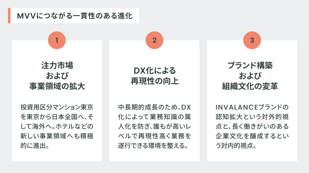 INVALANCEの進化は、すべてMVVの実現につながる形で一貫性が保たれています。そのなかで、特に重視しているのは、以下の3つのポイントです。