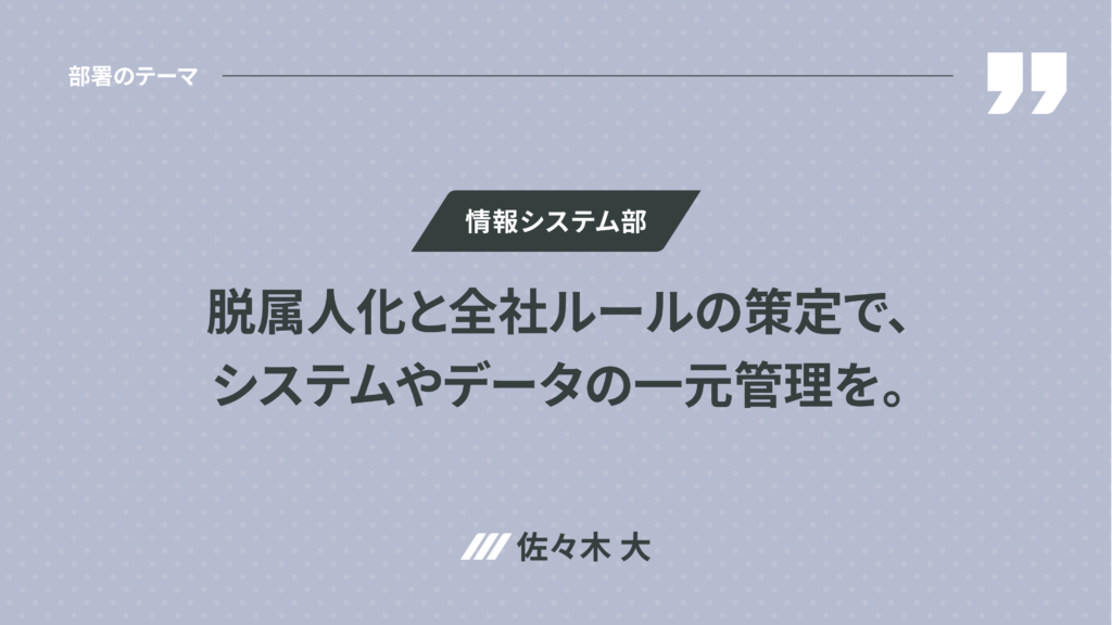 ◉ 情報システム部 佐々木大 : 事業運営の効率化と業務品質の向上を支えるために、INVALANCE全体のシステムやデータを一元管理できる体制を整えるのが、私たち情報システム部門の最も大きなミッションです。「システムはあるのに十分に使いこなせない」というケースを無くしていきたいと考えています。そのために必要なのが、「全社IT基盤の統合」と「運用ルールの標準化」。基幹システム選定・改修、セキュリティ強化、IT教育体系化などに取り組み、脱属人化と全社統一ルールの策定に向けて進んでいます。