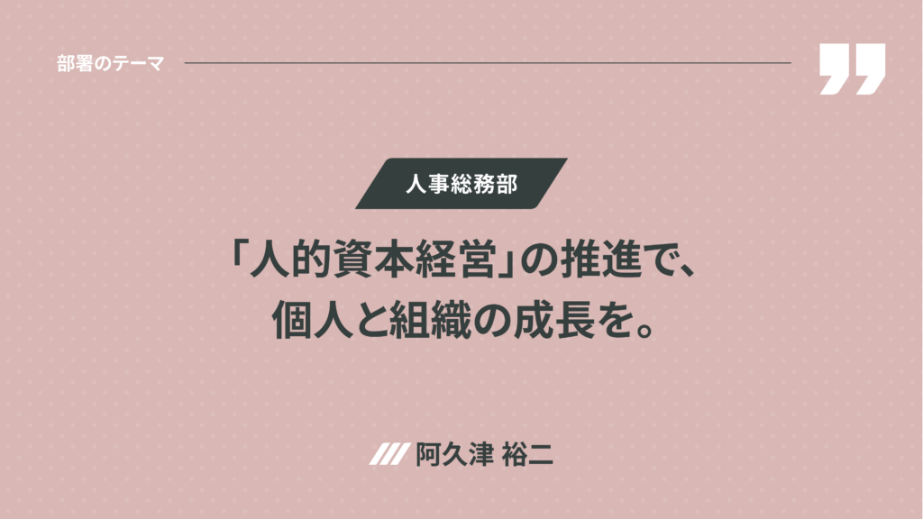 ◉ 人事総務部 阿久津裕二 : 個々の成長を促し、チームと組織のレベルアップを進め、会社の価値向上を推進しています。知識とスキルを共有・標準化できる体制を整えるとともに、法務体制強化によるコンプライアンス意識向上も重要となります。属人化の解消、法務・遵法意識の向上、多様性の推進、女性管理職比率の向上、柔軟な働き方の定着を進めることで、多様な人材が活躍できる「人的資本経営」を実現します。