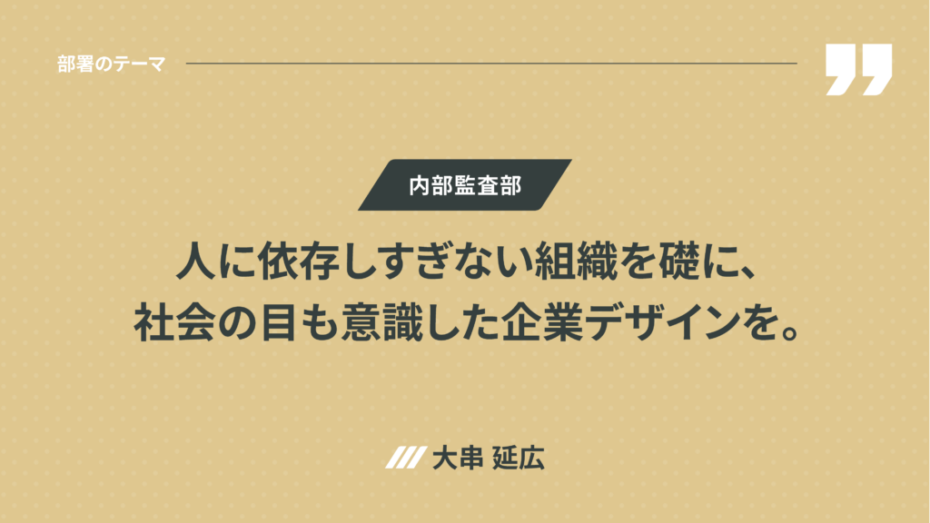 ◉ 内部監査部 大串延広 : 企業としての信頼性を高め、事業を安定的に成長させるためにリスク管理と改善提案を通じて経営判断を支えています。目下の課題は優秀な人材の確保と育成。既存サービスの精度向上と組織成熟を重視し、DX化により「人に依存しすぎない組織づくり」を目指します。内部監査を高度化し、外部評価の取得も視野に入れています。重要なのは、良い部分を残しながら、改善すべき部分から目を背けないこと。INVALANCEらしい寛容さは保ちつつ、社会の目も意識した企業文化をデザインしていきます。