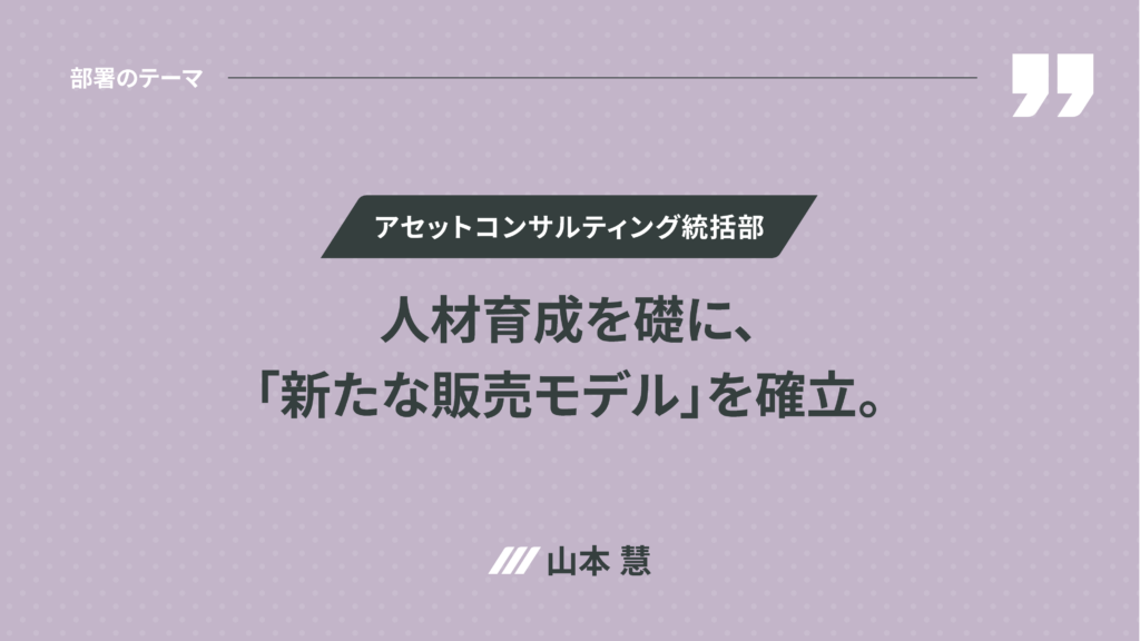 ◉ アセットコンサルティング統括部 山本慧 : 多様な顧客に価値を届けていくために日本全国、そして、海外まで販路を拡大し、「新たな販売モデルの確立」を目指しています。これまでの成功事例に学びながら、法人販売モデルの構築、海外投資家の獲得、地域に依存しない営業体制づくりなどを並行して進行しています。今後は人材育成と販売実績創出に一層注力し持続的に成長できる営業を指揮をつくっていきます。