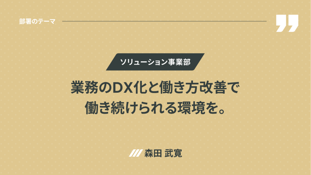◉ ソリューション事業部 森田武寛 : 私たちはオーナー様のリスクをゼロにすることを大目的としながら「契約業務のDX化」、そして、「働き方の改善」をめざします。現在は、契約プロセスの標準化、海外投資家対応のフロー整備、火災保険管理体制の構築に取り組んでおり、帳票作成自動化とチーム制により、業務負荷の分散を可能にする仕組みづくりを進めます。いつまでも、ずっと働き続けられる環境を作っていきたいですね。
