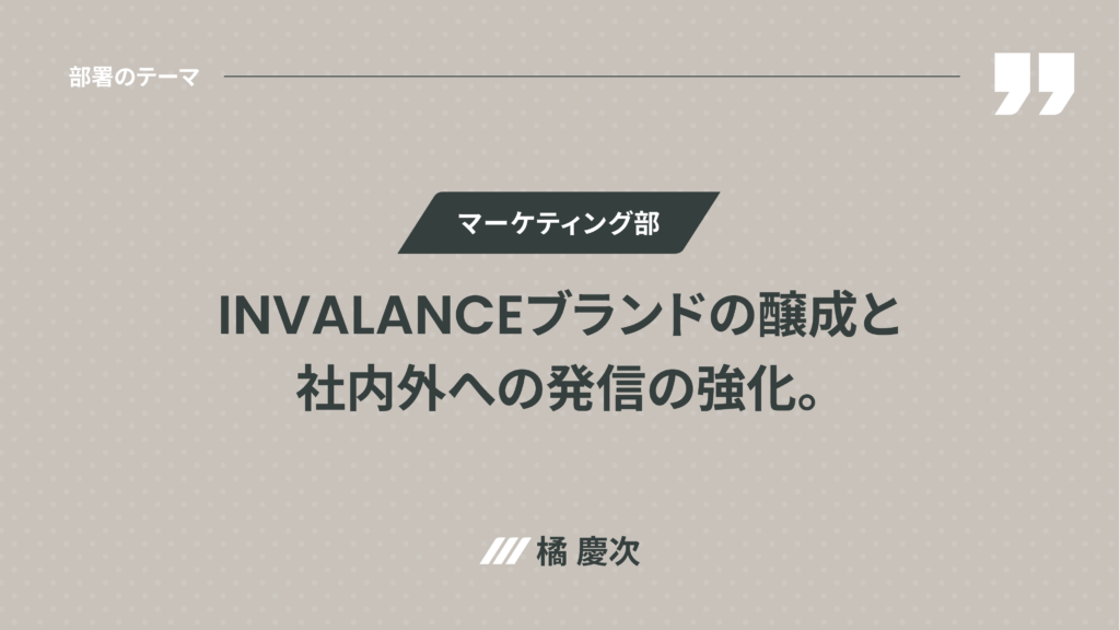 ◉ マーケティング部 橘慶次 : マーケティング部では、「INVALANCEブランドの構築と認知拡大」と「誇りを持てる企業文化の醸成」をつなげていくことで、一貫したブランディングを進めていきます。企業姿勢、事業価値、オーナー事例などを軸にブランドを構築し、今後は顧客理解とブランド戦略の精度向上、反響・成果へとつながる社内外への文化発信をさらに強化していきます。