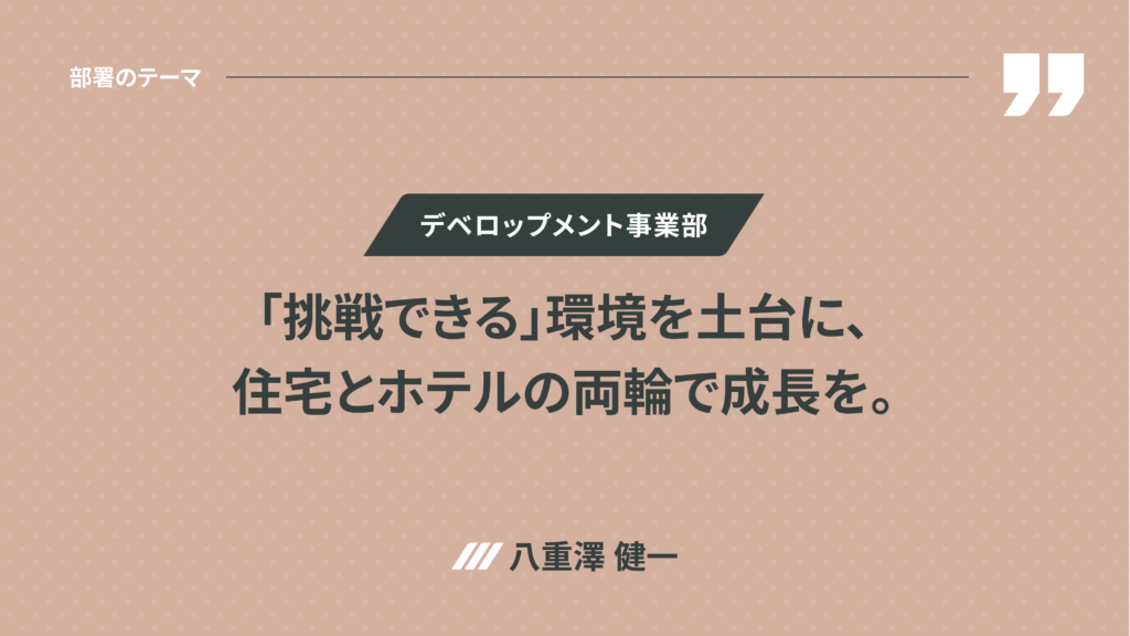 ◉ デベロップメント事業部 八重澤健一 : INVALANCEのCORE BUSINESSである投資用区分マンション業界No.1に向け高品質な商品の安定供給を目指すと同時に、NEW BUSINESSの領域では都市に新たな滞在価値を生み出すホテル開発へも積極的に参入します。CORE BUSINESSでは、継続してマンション用地の仕入れを強化しながら、ホテルを新たな事業の柱に育成していく試みを本格的に始動します。誰もが挑戦できる働き方を実現しながら、「住宅」と「ホテル」の両輪で成長を図ります。