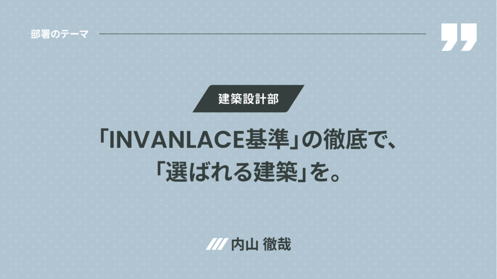◉ 建築設計部 内山徹哉 : 私たちが設計するのは建物ではなく、「長期にわたって価値が続く暮らしと信頼」です。「住宅」と「ホテル」、用途の異なるその両方の領域で「INVANLACE基準」を設計します。快適性、安全性、デザイン性、持続的資産価値を統合した設計基準を確立し、省エネ、環境技術、IoTなど未来要素も取り込むことで「選ばれる建築」を、誰もが一定品質で設計できる組織づくりを進めていきます。