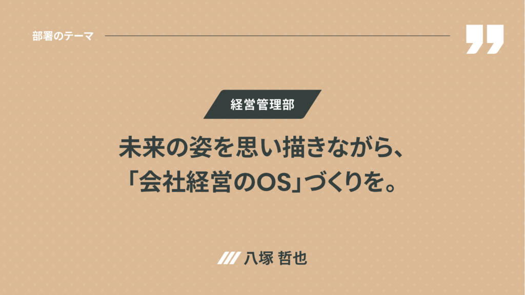 ◉ 経営管理部 八塚哲也 : 私たち経営管理部では、体制再編と仕組み化により「会社経営のOS(オペレーションシステム)づくり」を目指しています。会社全体のガバナンスと経営基盤を整えることに加え、脱Excel、情報システム化を推し進めており、今後は経営企画領域を独立させて分析・予測体制を強化していきます。「未来の姿」を描くことで、社員が安心して働ける環境づくりに加え、士気と誇りを高まる基盤を整えたい。そう考えています。