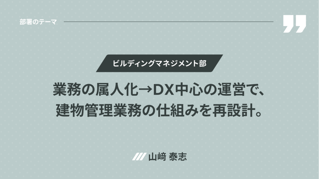 ◉ ビルディングマネジメント部 山﨑泰志 : オーナー様に安心して管理を任せていただくために、建物管理業務の仕組みをゼロから再設計することで業界水準以上の管理品質を目指します。規約・修繕計画・帳票の全面刷新を進行しており、法改正への対応や組合向けコミュニケーション基盤の構築を進めています。将来的には業務の属人化を撤廃し、DX中心の運営へと移行していきます。