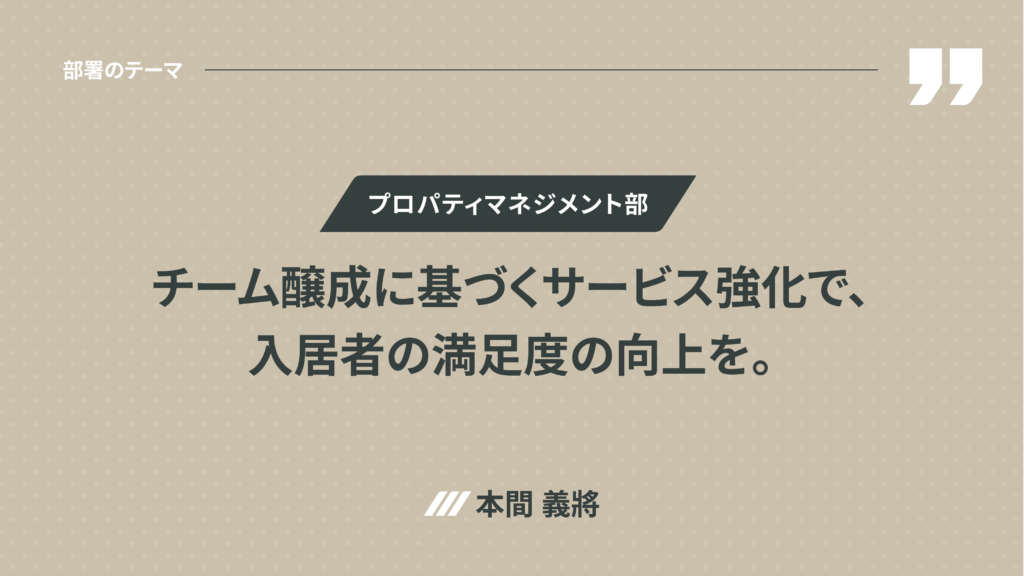 ◉ プロパティマネジメント部 本間義將 : 入居者様の満足度を高めるために、契約情報の一元管理や帳票作成フロー改善など業務効率化を遂行。また賃貸管理業務のDX化によって業務を簡略化することで、入居者の満足度を高め、賃貸管理の質が企業価値に直結するように進化を目指します。スマートキーや顔認証などのスマートホームテクノロジーを取り入れた物件など新方式の賃貸管理もスタート。メンバー間の業務の偏りを防ぐため、チーム全体でのフォロー体制と文化醸成もあわせて進めていきます。