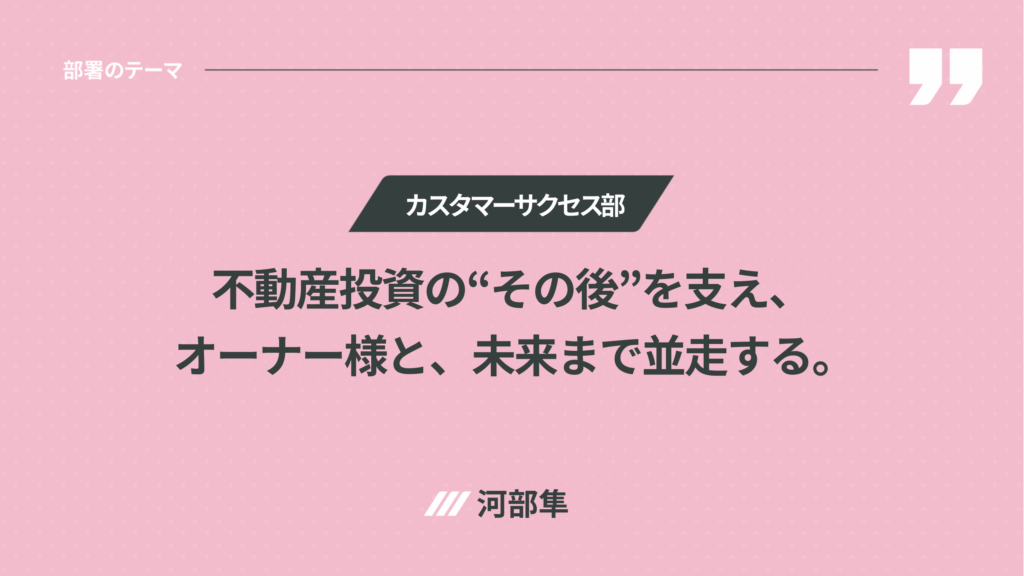 ◉ カスタマーサクセス部 河部隼 : 不動産投資は「購入後からが本当の価値提供」。オーナー様に長く寄り添い、安心して資産運用を続けていただくことで、INVALANCEの競争優位性を支えています。2024年に立ち上がった新たな部署として、オーナー様向け年次イベントの開催など、受け身ではなくこちらから価値を届ける取り組みを開始。購入後だからこそ必要な知識や情報を提供し、信頼関係の深化を図っています。営業経験を持つメンバーが中心となり、オーナー様と社内各部署をつなぐカスタマーサクセス部は、顧客満足度向上の要であり、新たなキャリアパスを示す存在として成長を続けています。